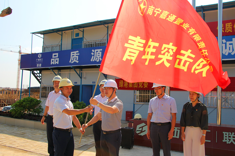 在授旗儀式中,集團黨委書記、董事長、總經理龔國強對南寧科技產業(yè)園項目人員前期所做出的工作給予了充分肯定,贊揚了黨員先鋒隊員、青年突擊隊員和工人朋友們?yōu)轫椖拷ㄔO所付出的艱苦和努力,當前項目進展取得了較好的成績。自8月12日南寧科技產業(yè)園項目正式開工以來,嘉通公司黨支部帶領工人們日夜苦干,千方百計克服惡劣的臺風天氣等不利因素,在短短的2個月時間便完成1#樓廠房一層的搭設模板,2#、3#樓回填基礎土方,4#樓防水保護層澆筑以及9#宿舍樓基礎承臺澆筑等工作,充分展現(xiàn)了綠港鐵軍風采。下一步,希望全體黨員先鋒隊、青年突擊隊隊員們以此次授旗為契機,繼續(xù)發(fā)揚綠港鐵軍精神,創(chuàng)先爭優(yōu),攻堅克難,加快推進項目建設,確保項目如期建成交付。