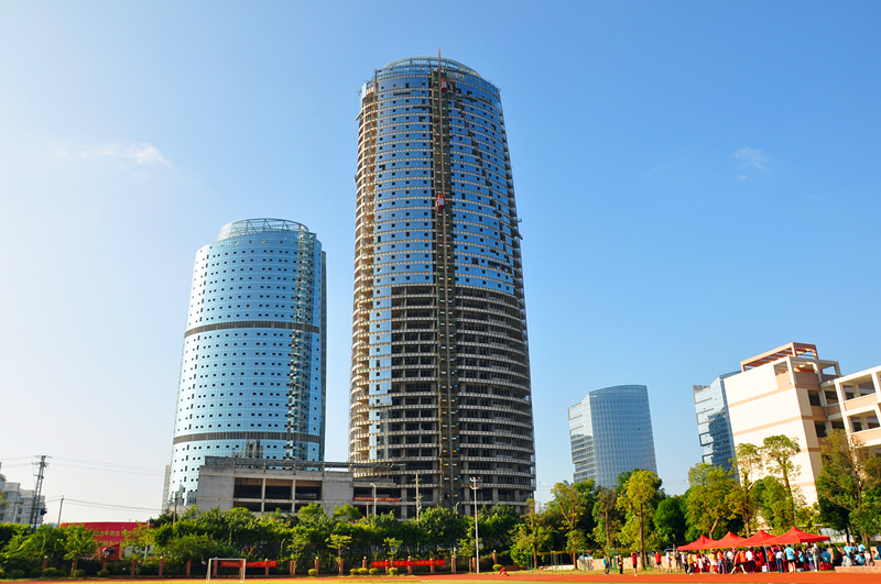 《建設(shè)中的綠港國(guó)際中心》(榮鑫公司 趙志業(yè))圖片說(shuō)明:綠港國(guó)際中心正在做外墻玻璃裝飾施工,在陽(yáng)光的照耀下美麗而雄偉。球場(chǎng)上的運(yùn)動(dòng)員意氣風(fēng)發(fā)。預(yù)示著綠港集團(tuán)充滿(mǎn)活力。